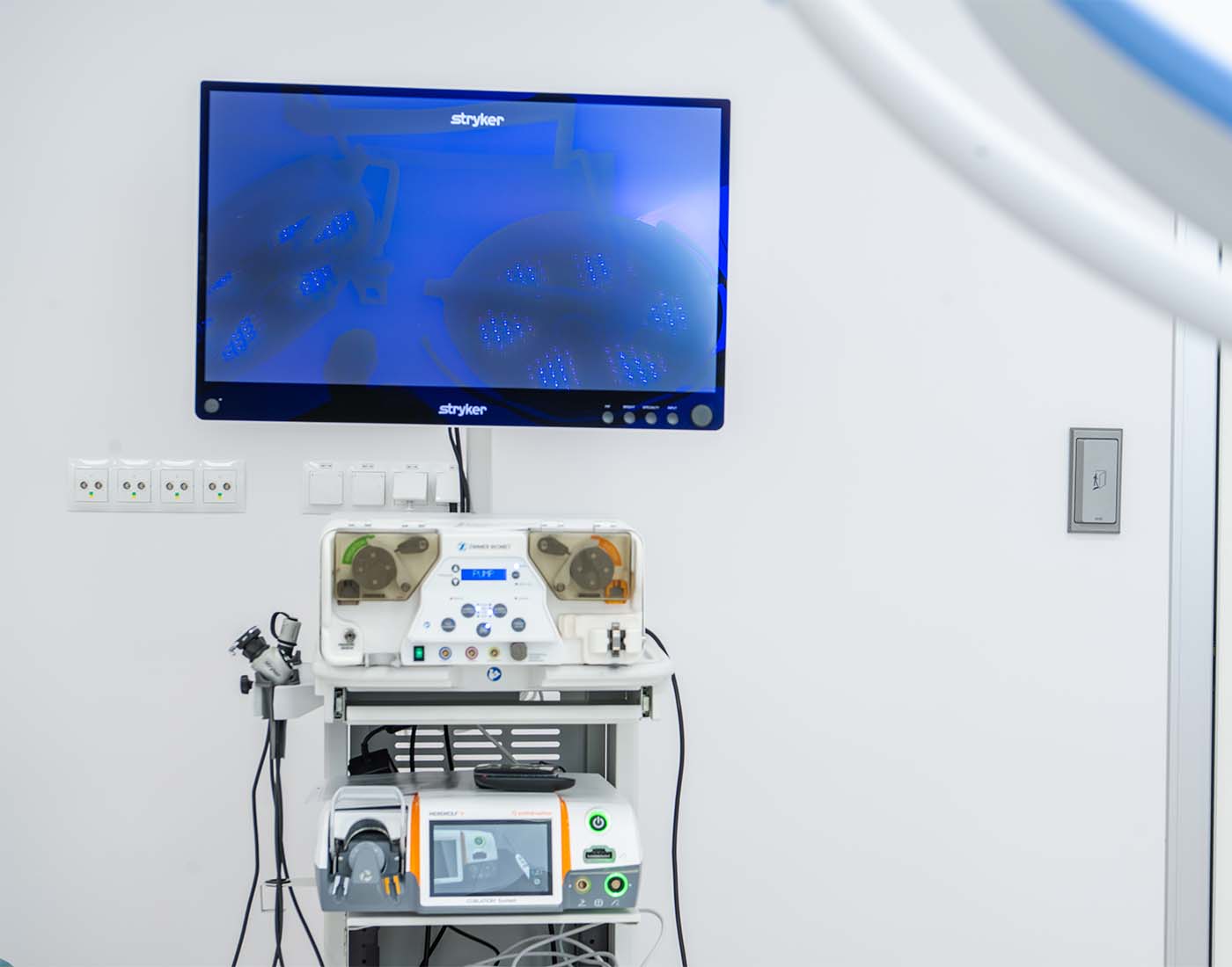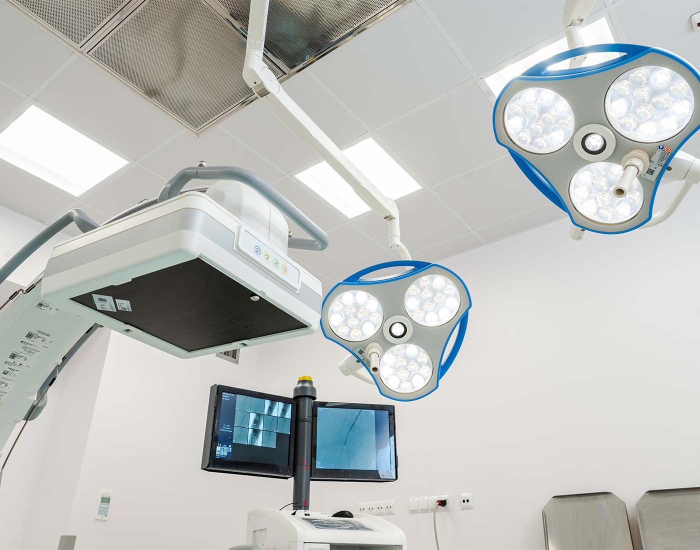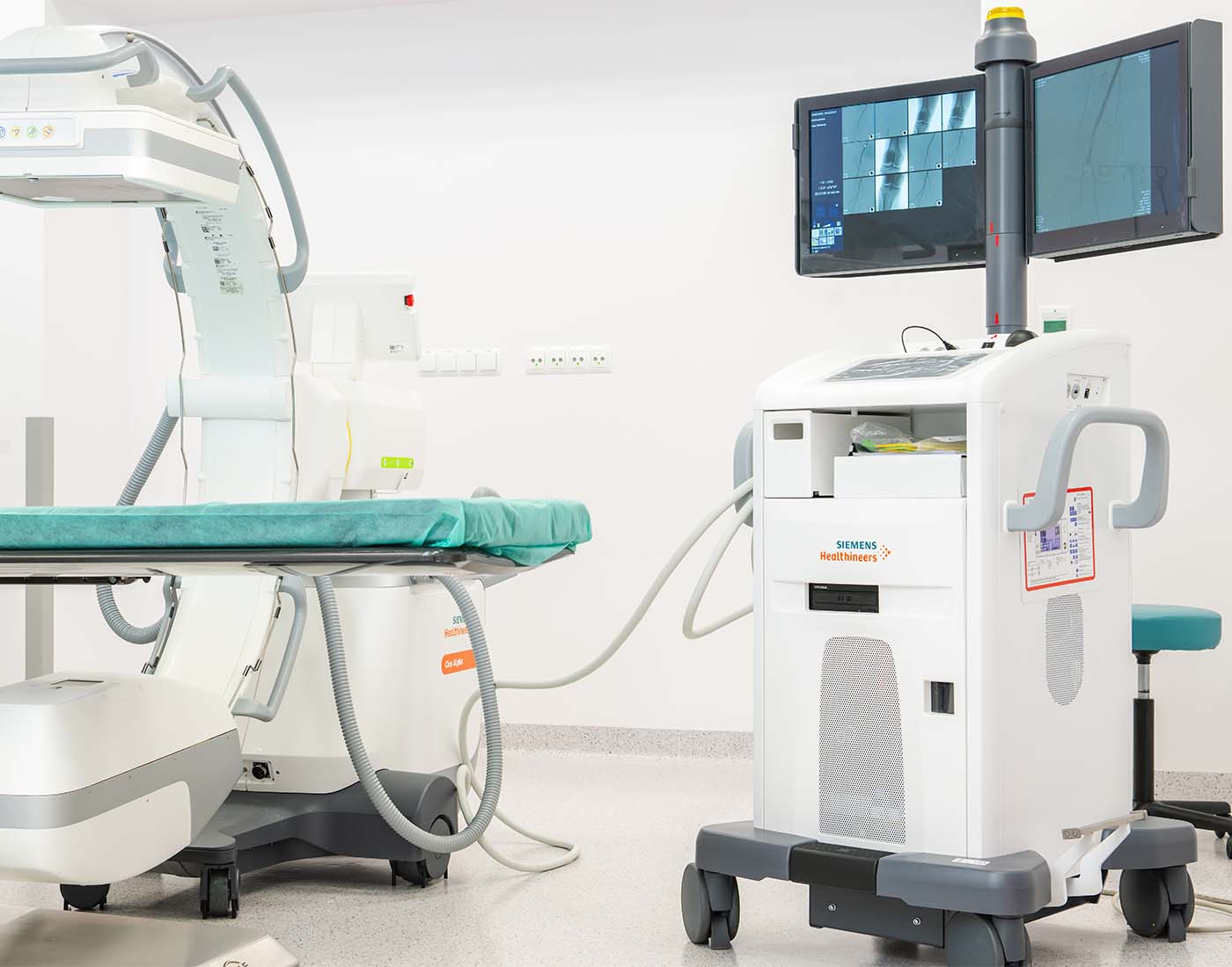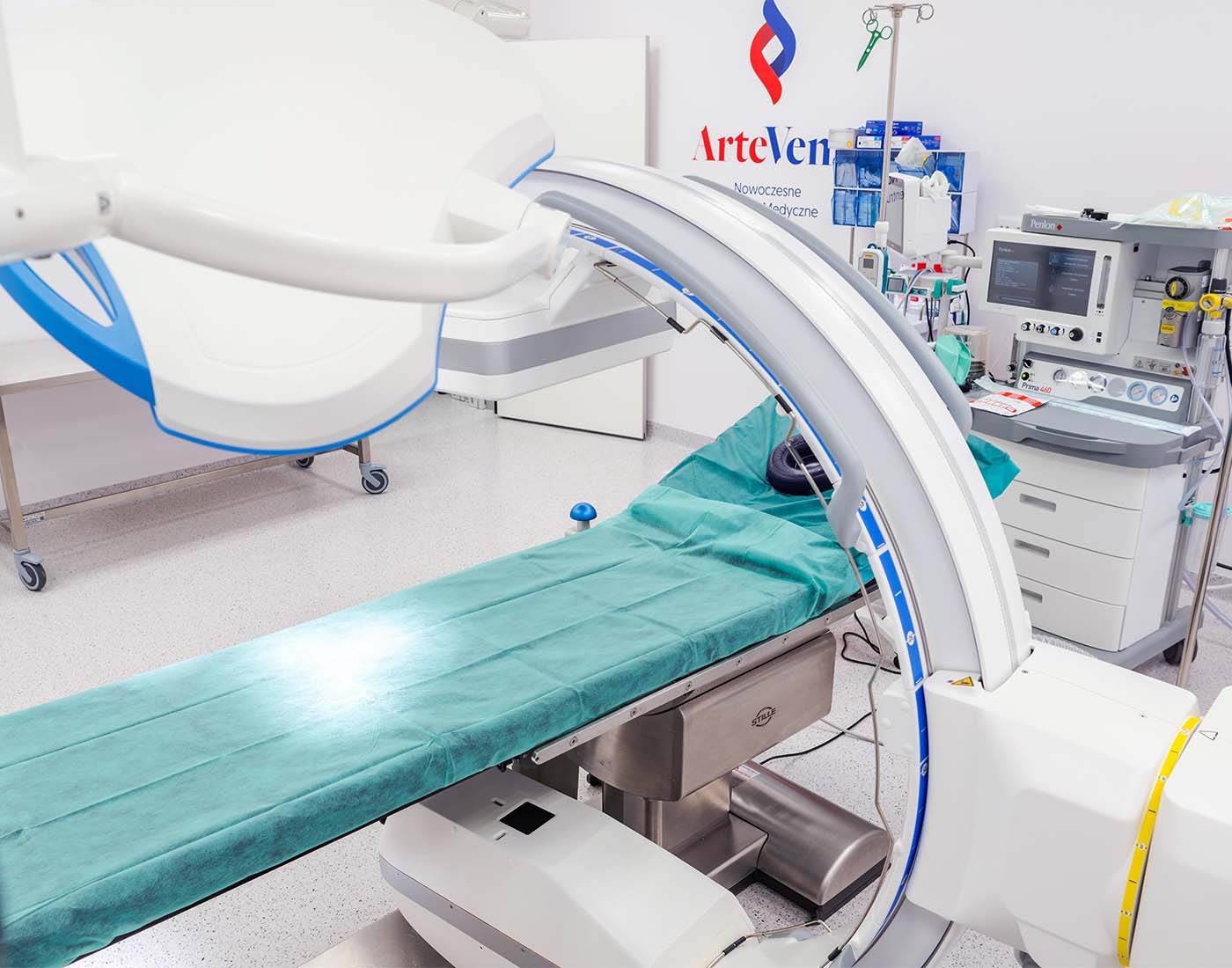 Sale wyposażone są w zaawansowany sprzęt, w tym mobilne ramię C (RTG), USG dopplerowskie oraz specjalistyczne narzędzia do chirurgii naczyniowej, co gwarantuje precyzję i bezpieczeństwo.